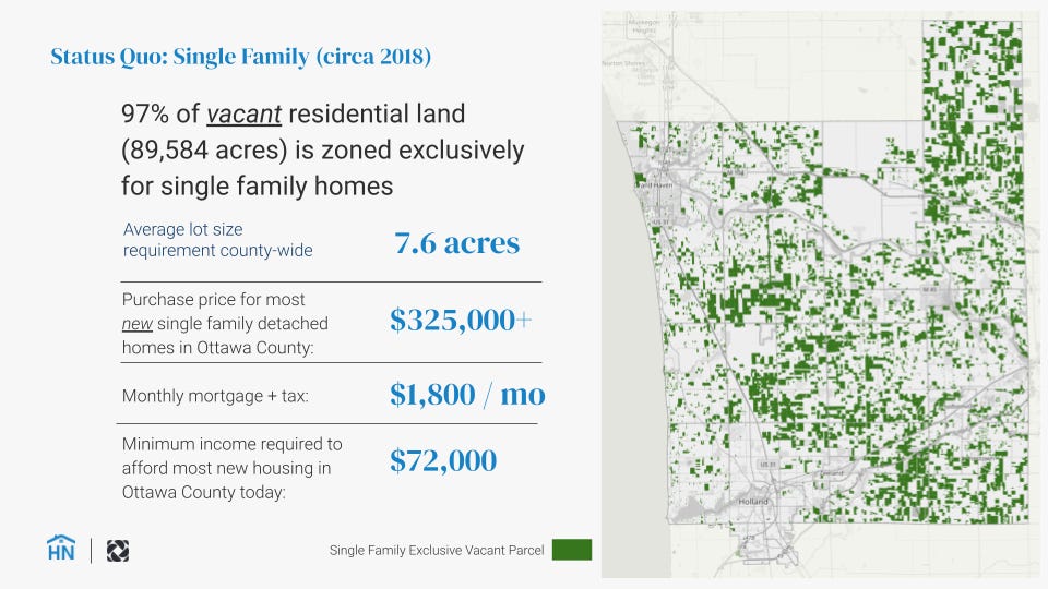 So, once again, we dove into the data and discovered that the vast majority of homes being built were 2,400 square feet or larger and most of the land zoned for new homes required large lots of an acre or more - even when served by public infrastructure.